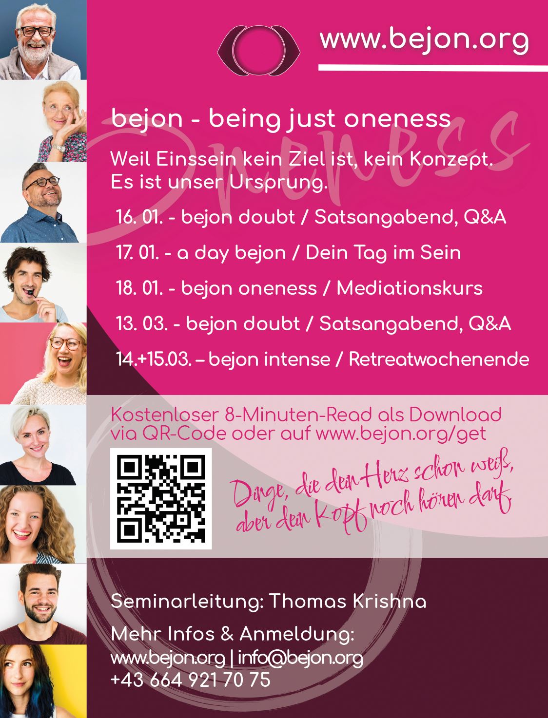 Wir brauchen kraftvolle Werkzeuge. Die Oneness-Meditation ist eines davon. Sie macht erfahrbar, was es heißt, jenseits des Gewohnten zu sein – bejon zu sein. Und wenn man das einmal erlebt hat, entsteht oft der Entschluss: Das nährt mich. Das tut mir gut. Das ist wahre Freiheit. Daraus will ich leben. Ab da beginnt die Vertiefung: Wir erkennen, welche Muster wir in Beziehungen leben, welche Muster unseren Wert, unsere Freiheit, unsere Macht definieren. Dann können wir sie transzendieren, was uns auf eine Daseinsebene führt, in der das Außen weniger Bedeutung hat, weil die innere Stabilität aus den Essenzen kommt: Freude. Friede. Liebe. Freiheit. ■