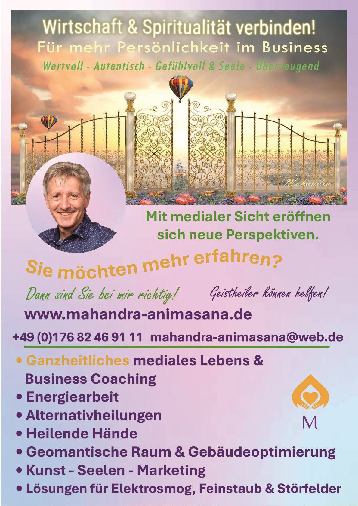 Das ganzheitliche, mediale Coaching geht über klassische Ansätze hinaus: Es verbindet moderne wissenschaftliche und spirituelle Erkenntnisse mit praxisnaher, empathischer Begleitung. Es ist eine ganzheitliche Form für Körper, Geist und Seele. Wenn notwendig, beziehe ich im Coaching, die heilenden Hände, die spirituelle und psychologische Begleitung mit ein. Ich helfe Ihnen dabei Blockaden und Themen auf Körper-, Geist- und Seelenebene ganzheitlich und lösungsorientiert herauszufinden und zu lösen.