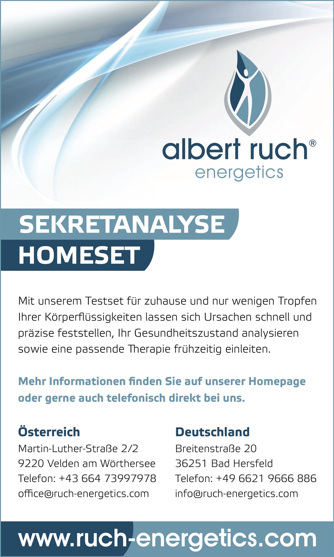 Wo herkömmliche Laborwerte keine Ergebnisse zeigen, die auf eine Borrelieninfektion hinweisen, kann dieses einzigartige Messverfahren, die Sekrettestung, bereits kleinste Funktionsstörungen im Körper auffinden, die durch Viren, Bakterien, Pilze oder Parasiten ausgelöst werden. Nach der Auswertung der Sekrete wird gleichzeitig auch ein Behandlungsvorschlag individuell für jeden Einzelnen erstellt. So ist eine umfassende Genesung möglich. Durch diese Methode können wir (albert ruch® energetics) bei der Behandlung von Borreliose, bei denen bisher keine andere Therapie dauerhaft geholfen hat, große Erfolge erzielen. ■